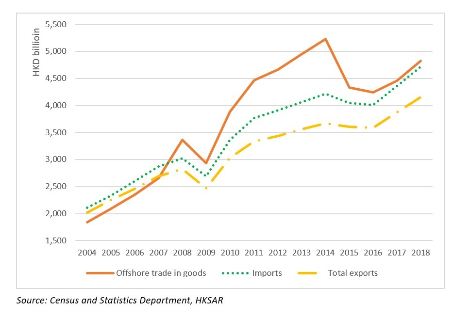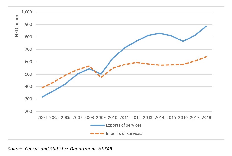 In recent years, news reports often use cargo throughput as a measure of Hong Kong trade activities and claim Hong Kong is not competitive anymore. However, our students found out the values of both exports and imports of goods have been increasing for decades (figure 1). A more important finding is that exports and imports of services have also been rising quite rapidly for the last 10 years (figure 2). These statistics means Hong Kong trading firms no longer import the products to Hong Kong and re-export it (traditional Onshore Trade), instead, they are now providing services to ship the products directly from countries to countries without going through Hong Kong (Offshore Trade).